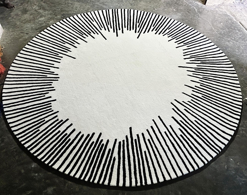Modern Hand Tufted Round Area Rug | Black & White Sunburst Design Rug.